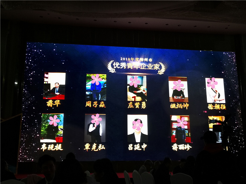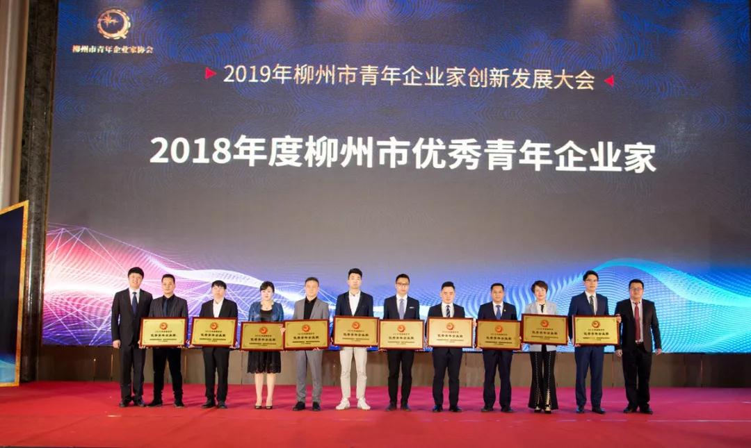 ▲團(tuán)市委書記張閏、副書記段志高為2018年度柳州市優(yōu)秀青年企業(yè)家頒獎(jiǎng)(右四為蔣華)