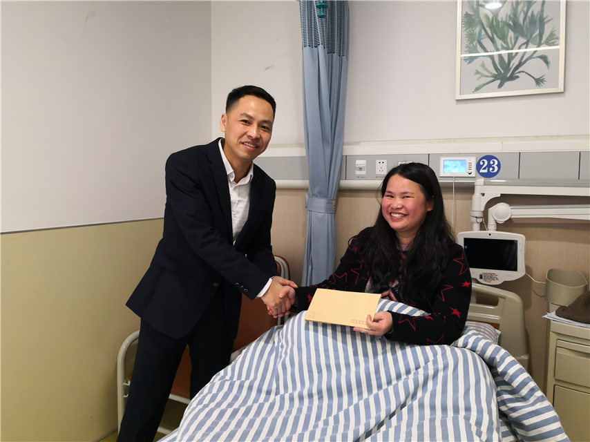 ▲王志男副校長細心詢問黃慧婷老師的病情和治療情況,鼓勵她要樹立信心,積極配合治療,爭取早日康復,黃慧婷老師對育才的牽掛和慰問表示由衷的感謝。