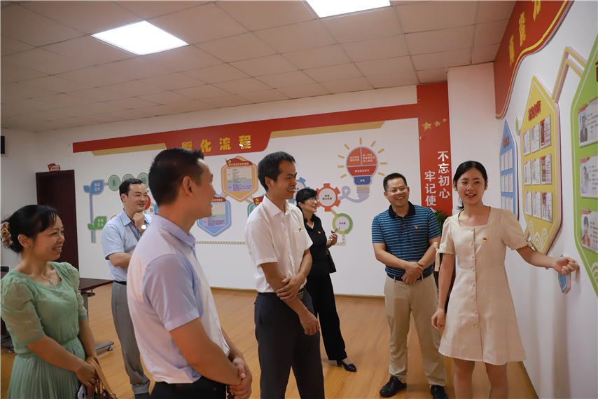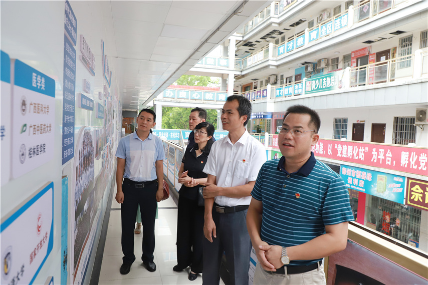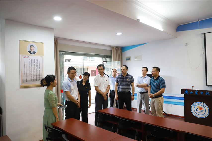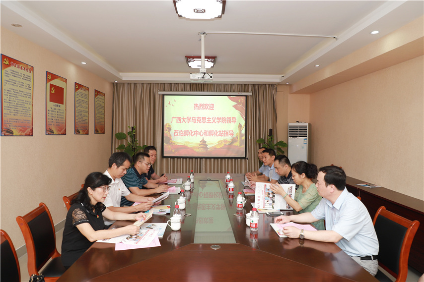 ▲廣西大學(xué)馬克思主義學(xué)院黨委書記周瑞超(中)、副處級(jí)組織員冷相宜(右三)、魚峰區(qū)委組織部副部長(zhǎng)于俊發(fā)(左三)了解孵化站師資力量
