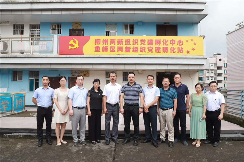 ▲廣西大學(xué)馬克思主義學(xué)院黨委書記周瑞超(左四)、副處級(jí)組織員冷相宜(左三)、柳州市委組織部組織四科科長(zhǎng)池福波(右三)、魚峰區(qū)委組織部副部長(zhǎng)于俊發(fā)(左二)參觀孵化站建設(shè)