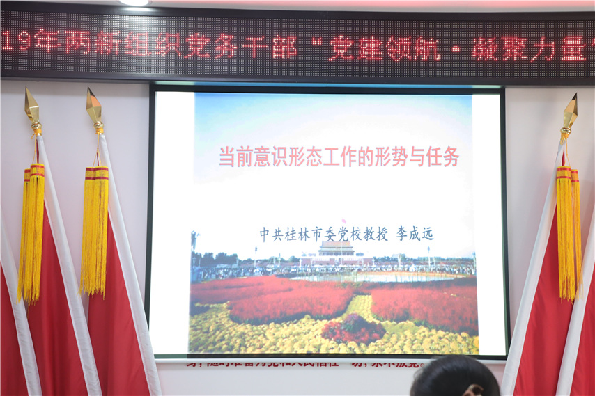 培訓(xùn)邀請了中共桂林市委黨校教授李成遠(yuǎn)作《當(dāng)前意識形態(tài)工作的形勢與任務(wù)》專題講授,李教授為大家分析了當(dāng)前在意識形態(tài)方面存在的機(jī)遇與挑戰(zhàn),闡述了中國意識形態(tài)安全所面臨的主要問題,提出了新形勢下維護(hù)我國意識形態(tài)安全的基本途徑。