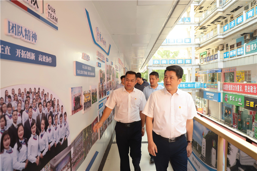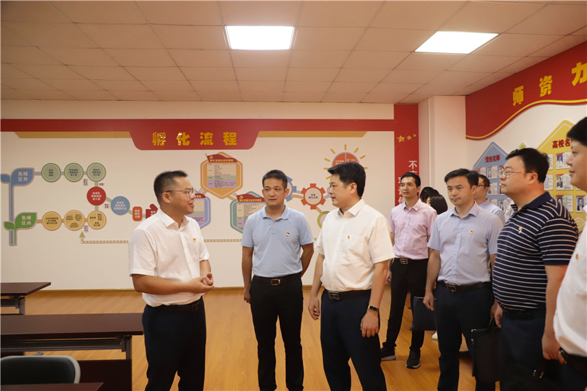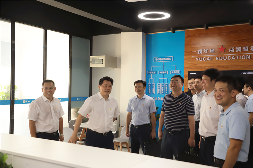 ▲團中央調(diào)研組組長、團廣西壯族自治區(qū)委書記李楚(右二),團寧夏回族自治區(qū)委副書記丁聃(右三)、團柳州市委書記張閏(前排左二)、中共魚峰區(qū)委副書記王漢強(右一)參觀柳州市非公團建示范點--廣西育才教育集團團建陣地