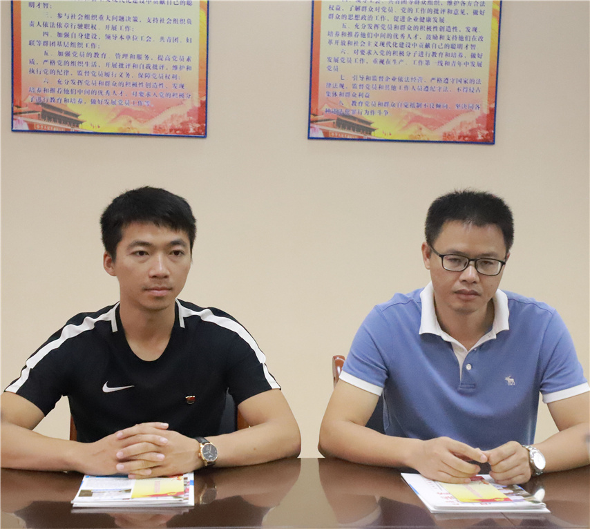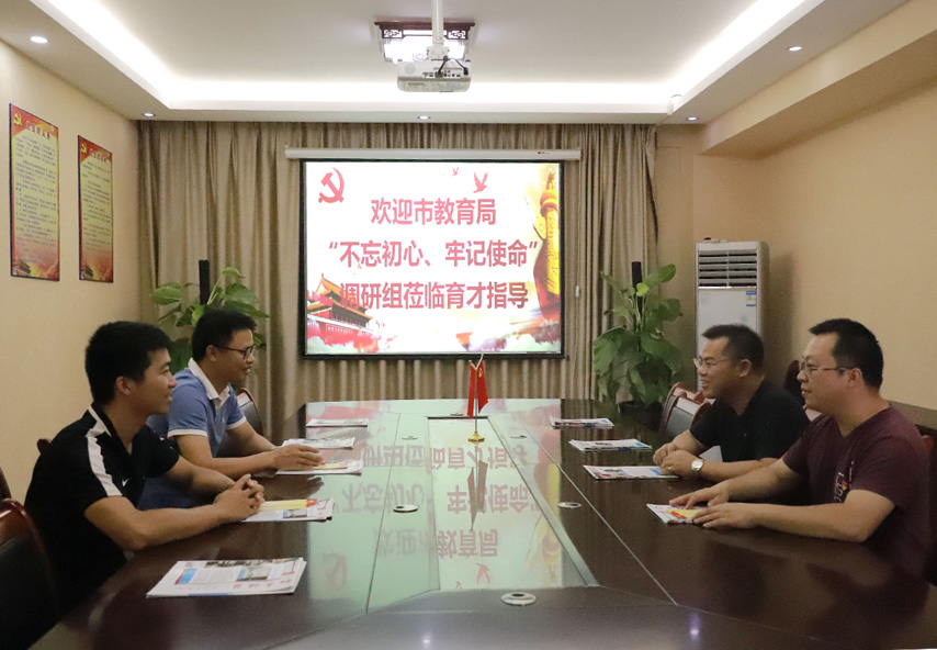 ▲市委教育工委、市教育局黨組“不忘初心、牢記使命”主題教育領(lǐng)導(dǎo)小組第二巡回指導(dǎo)組組長、市一職校黨總支副書記周軼群(右)蒞臨育才檢查指導(dǎo)主題教育工作