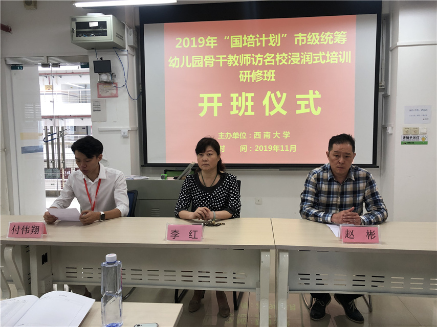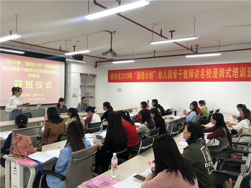11月2日???,?由西南大學網絡與繼續(xù)教育學院主辦、柳州市育才職業(yè)培訓學校承辦,為期8天的2019???年???“???國???????培???計???劃???”???市???????級???統(tǒng)???????籌幼兒園骨干教師訪名校浸潤式培訓研修在?????柳州順利開?????????班???,????柳州市教師培訓與學生素質教育中心??學前項目負責人李紅老師、集團聯(lián)合黨委委員、培訓學院副院長趙彬以及來自柳州各城區(qū)的30余名?????幼??兒??園??老?????????師?????參?????????加?????了開班儀式,儀式由培訓學院付偉翔老師主持。
