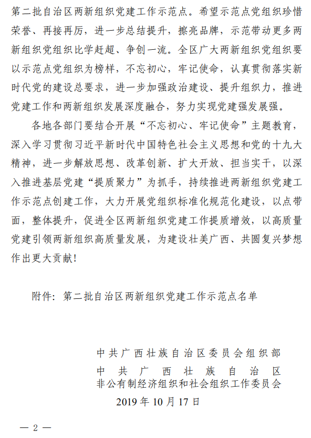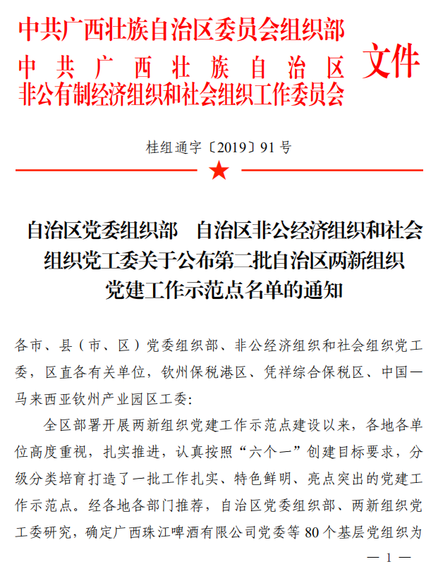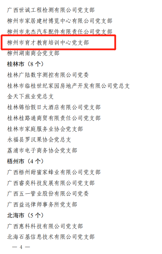 近日,廣西下發(fā)《自治區(qū)黨委組織部 自治區(qū)非公經(jīng)濟(jì)組織和社會(huì)組織黨工委關(guān)于公布第二批自治區(qū)兩新組織黨建工作示范點(diǎn)名單的通知》。經(jīng)各地各部門推薦,自治區(qū)黨委組織部、兩新組織黨工委研究,確定80個(gè)非公企業(yè)和社會(huì)組織黨組織基層黨組織為第二批自治區(qū)兩新組織黨建工作示范點(diǎn)。集團(tuán)聯(lián)合黨委下設(shè)的柳州市育才教育培訓(xùn)中心黨支部光榮上榜。