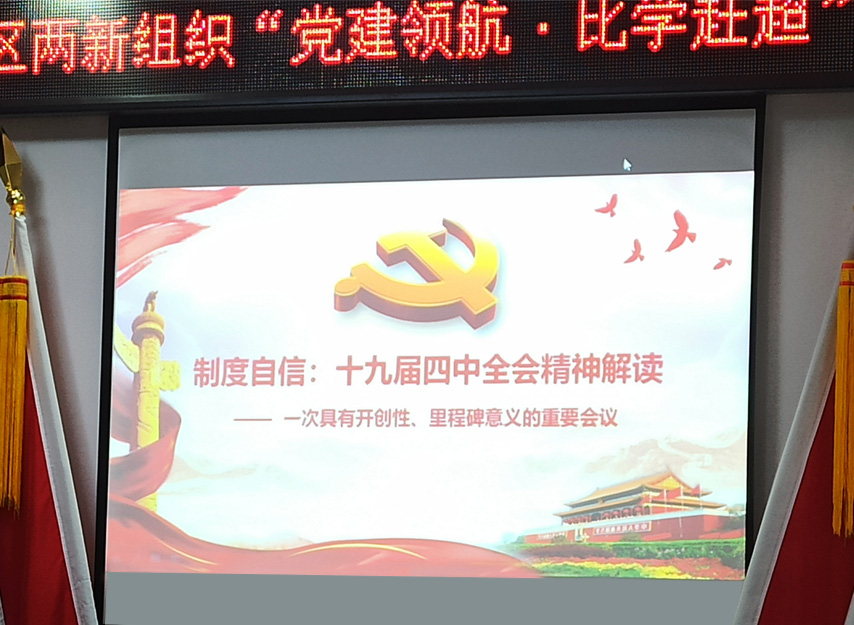 ▲柳州職業(yè)技術(shù)學(xué)院馬克思主義學(xué)院副院長(zhǎng)藍(lán)星華副教授以《制度自信:十九屆四中全會(huì)精神解讀》為題,深入解讀了黨的十九屆四中全會(huì)精神,為新時(shí)代兩新組織如何在黨旗引領(lǐng)下凝心聚力謀發(fā)展理清了思路。