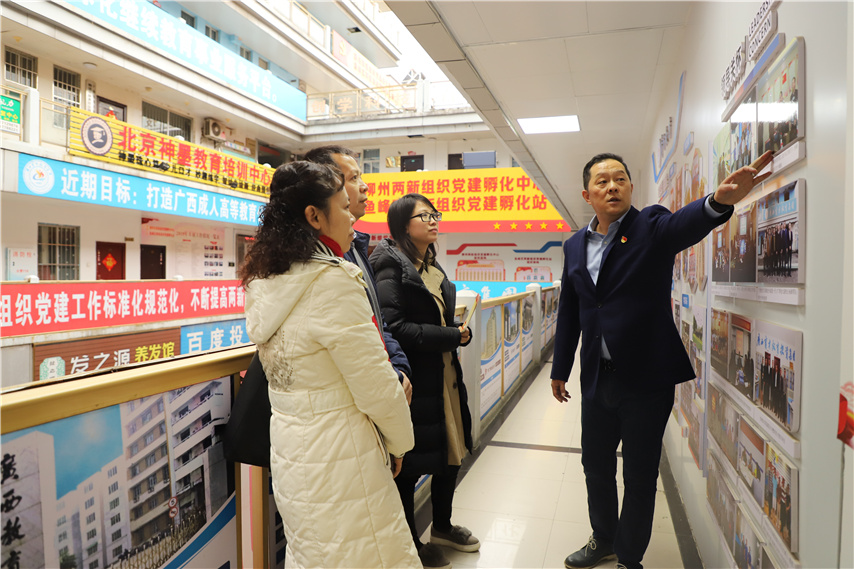 1月14日,桂林市委組織部部務(wù)會(huì)成員、兩新組織黨工委專職副書記陳薇薇,桂林市委組織部組織四科副科長(zhǎng)詹繼祥一行5人蒞臨柳州市兩新組織黨建孵化中心和魚峰區(qū)兩新組織黨建孵化站座談交流,柳州市委組織部組織五科科長(zhǎng)陸軍,魚峰區(qū)兩新組織黨工委副書記莫祥芬,集團(tuán)聯(lián)合黨委委員、孵化站辦公室主任、培訓(xùn)學(xué)院副院長(zhǎng)趙彬陪同座談交流。