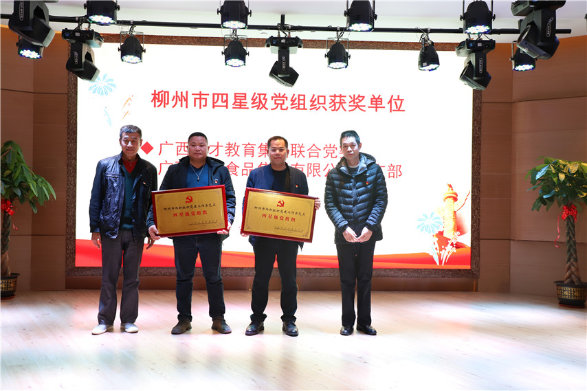 ▲集團黨委書記蔣華(右二)領(lǐng)取柳州市“四星級黨組織”榮譽獎牌