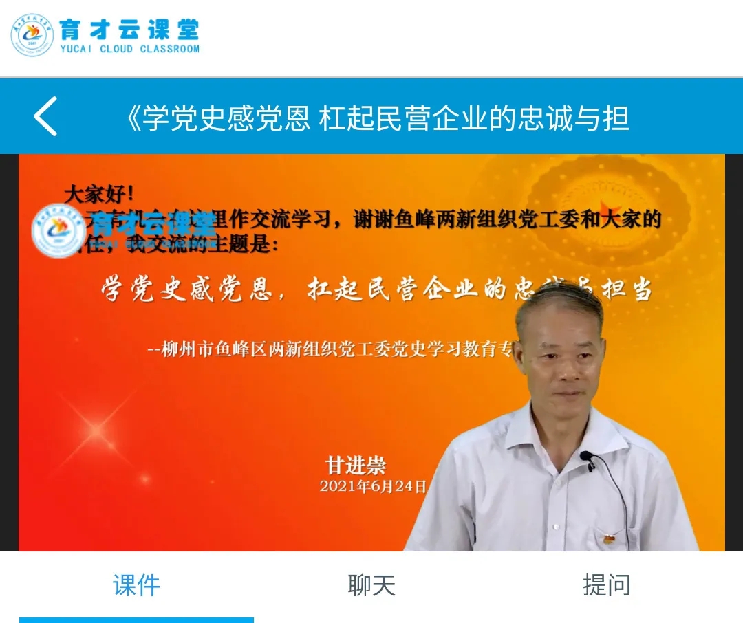 為推動兩新組織扎實開展黨史學習教育,提高兩新黨員黨性修養(yǎng),6月24日上午,魚峰區(qū)兩新組織黨工委運用育才“云課堂”開展了2021年第二期云黨課,邀請高級政工師、魚峰區(qū)兩新名師甘進崇為魚峰區(qū)兩新組織黨員干部上了一堂題為《學黨史感黨恩 杠起民營企業(yè)的忠誠與擔當》的直播黨課。