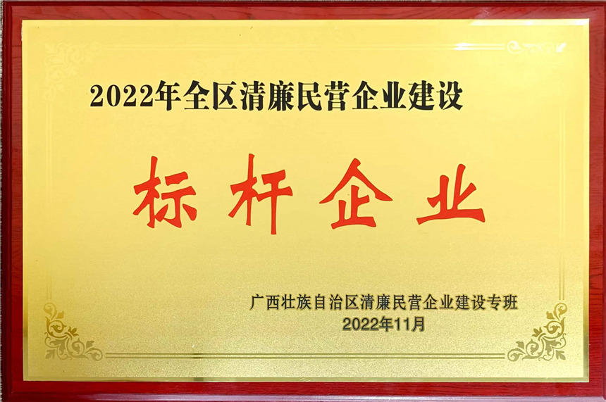 根據(jù)自治區(qū)黨委關(guān)于清廉廣西建設(shè)的部署要求,認(rèn)真落實(shí)清廉廣西建設(shè)工作現(xiàn)場(chǎng)推進(jìn)會(huì)精神,經(jīng)過(guò)培育創(chuàng)建、組織核驗(yàn)、推薦報(bào)送、審核等程序,且經(jīng)公示無(wú)異議,自治區(qū)清廉民營(yíng)企業(yè)建設(shè)專班公布了2022年全區(qū)清廉民營(yíng)企業(yè)建設(shè)標(biāo)桿企業(yè)名單(共111家),我集團(tuán)也是獲此殊榮的企業(yè)之一。會(huì)上,魚峰區(qū)政協(xié)副主席、工商聯(lián)主席戴翔為集團(tuán)授予自治區(qū)清廉民營(yíng)企業(yè)建設(shè)標(biāo)桿企業(yè)榮譽(yù)獎(jiǎng)牌。