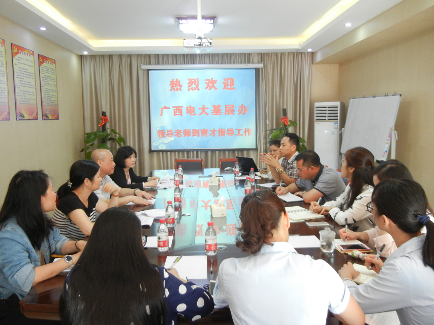 5月10日上午,廣西廣播電視大學基層辦主任黃耀誠、副主任毛漢碩一行4人到育才柳州總部指導培訓。育才教育黨支部書記、董事長蔣華、集團副總、柳州市育才教育培訓中心校長王志、常務副校長李彩梅參加了會議。