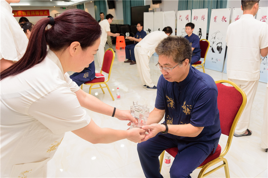 ▲學(xué)生向老師呈拜師禮(水晶方鼎)