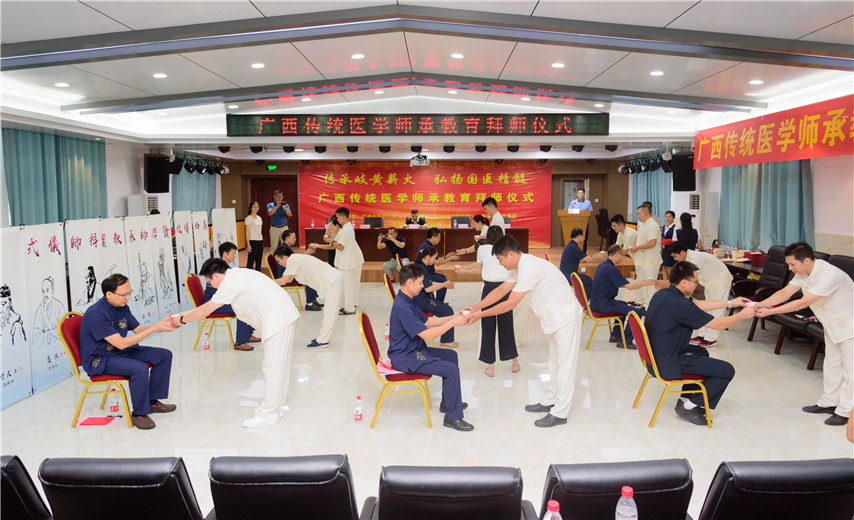 廣西傳統(tǒng)醫(yī)學(xué)師承教育第十三期欽州市中醫(yī)院班拜師儀式在欽州中醫(yī)院4號(hào)樓3樓學(xué)術(shù)廳順利舉行。廣西中醫(yī)藥大學(xué)成教院院長(zhǎng)、二級(jí)教授、博士生導(dǎo)師韋艾凌、副院長(zhǎng)黃瑞誠(chéng)、欽州市中醫(yī)醫(yī)院副院長(zhǎng)姚寶農(nóng)、育才集團(tuán)聯(lián)合黨委書記、董事長(zhǎng)蔣華以及師承班第十三期的指導(dǎo)老師和學(xué)員代表參加了儀式。