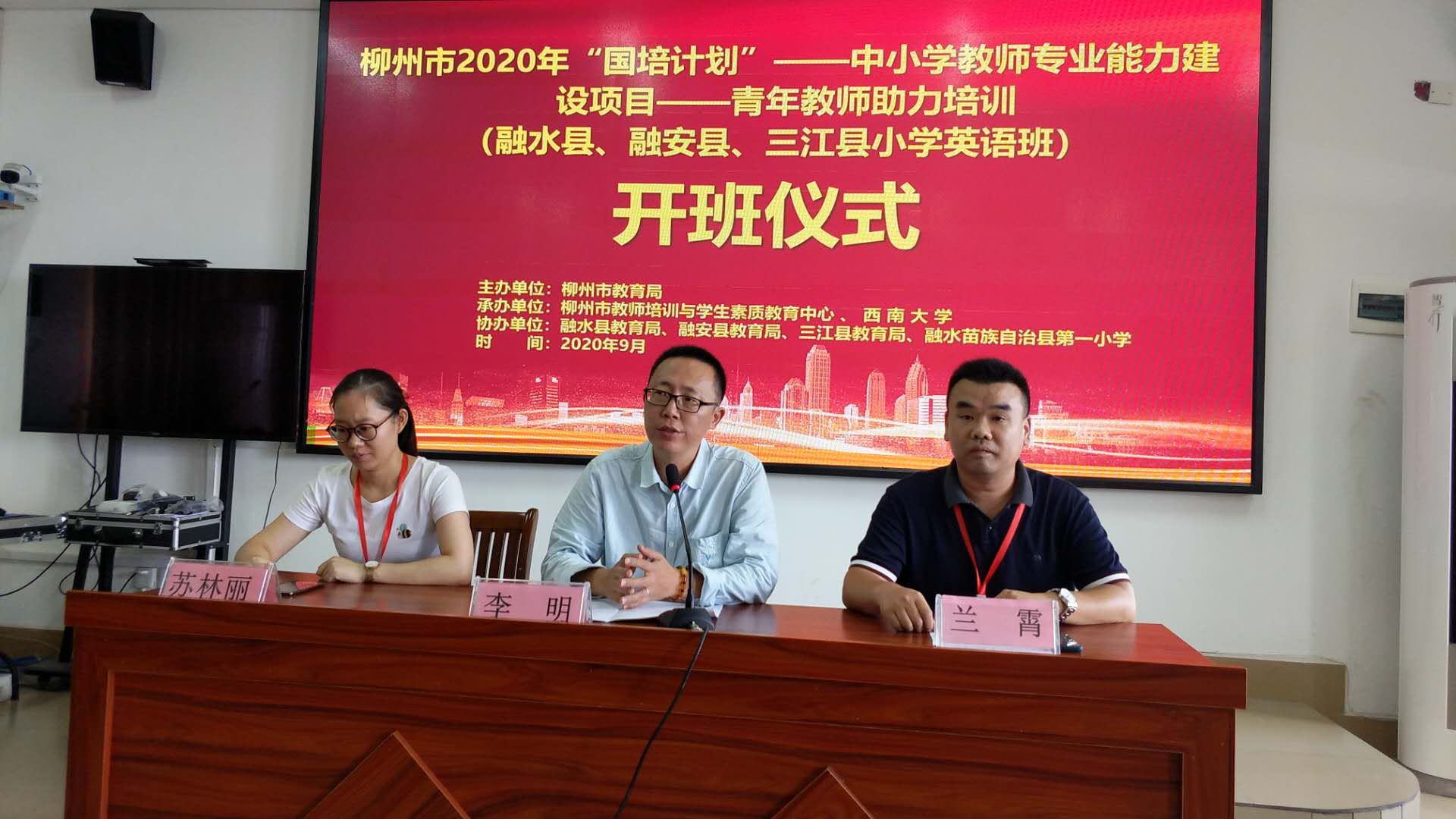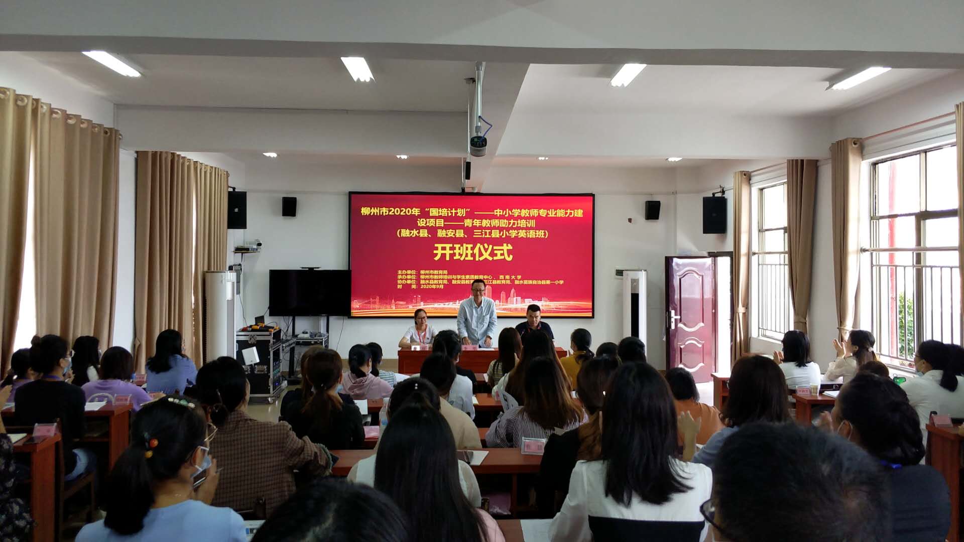 9月21日,2020年“國?計培?劃”柳州市青?教年?師?力助?培訓(xùn)(融水縣、融安縣、三江縣)小學(xué)英語班,在融水苗族自治縣順利開班,柳州市師培中心辦公室李明主任出?開席?班儀式并?講做?話,來自融水縣、融安縣、三江縣小?的學(xué)?50余名老師?加參?了培訓(xùn)。
