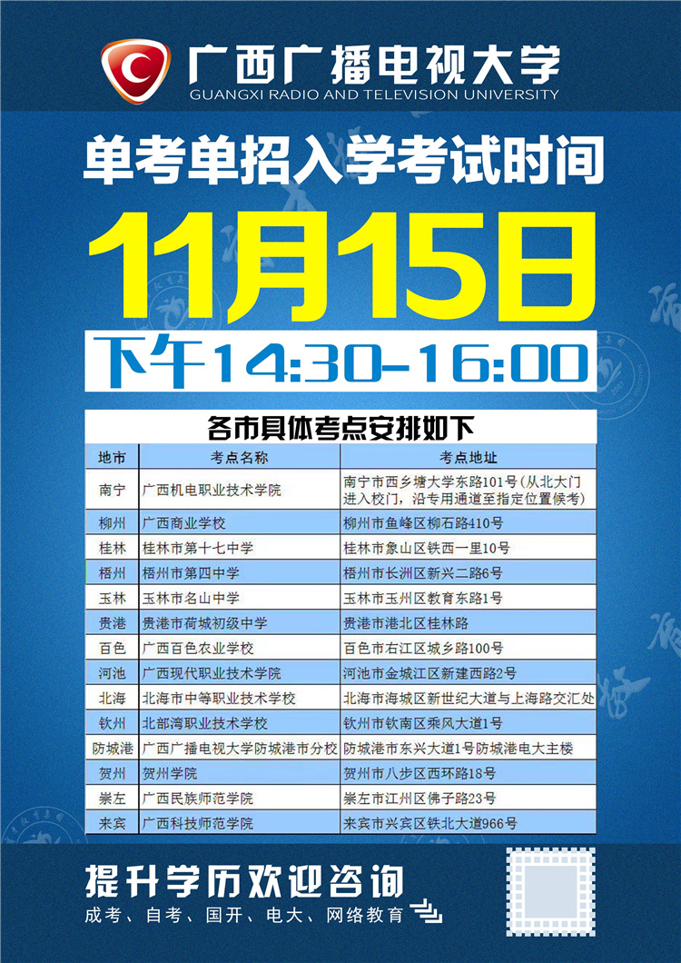 11月15日舉行廣西廣播電視大學(xué)單考單招入學(xué)考試