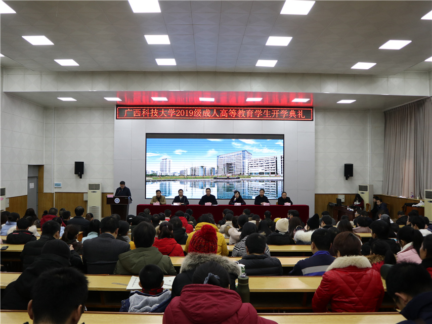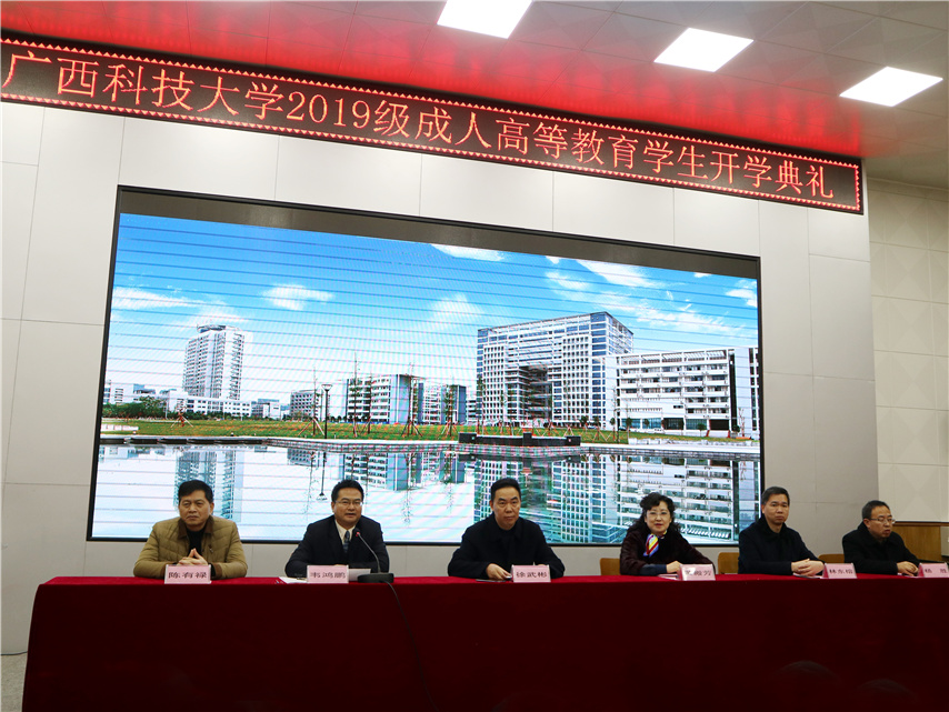 開學典禮在莊嚴的國歌聲中拉開了序幕。隨后,廣西科技大學副校長徐武彬代表學校向全體成教新生表示誠摯的問候和熱烈的祝賀,對長期以來關心和支持廣西科技大學成教工作的人們表示衷心的感謝。他著重介紹了廣西科技大學悠久的發(fā)展歷史、雄厚的師資隊伍建設等優(yōu)勢以及近年來在成人高等繼續(xù)教育方面取得的成績。他希望2019級的新同學樹立信念,克服困難,協(xié)調(diào)解決好工作、生活和學習三者之間的矛盾,根據(jù)教學的特點和要求,合理安排學習時間、提高學習效率、學有所成,在兩年半的學習生涯中,全面提高德商、智商和情商,以適應社會發(fā)展的需要,從而達到學歷提升和能力提升的雙豐收。