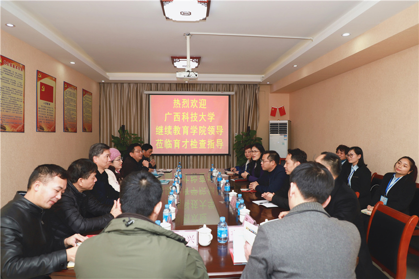 1月14日下午,廣西科技大學繼續(xù)教育學院黨總支書記黃殿芳、院長韋鴻鵬、副院長林東榕、楊勝、陳有祿以及各科室科長一行9人到育才教育集團柳州本部考察指導工作。