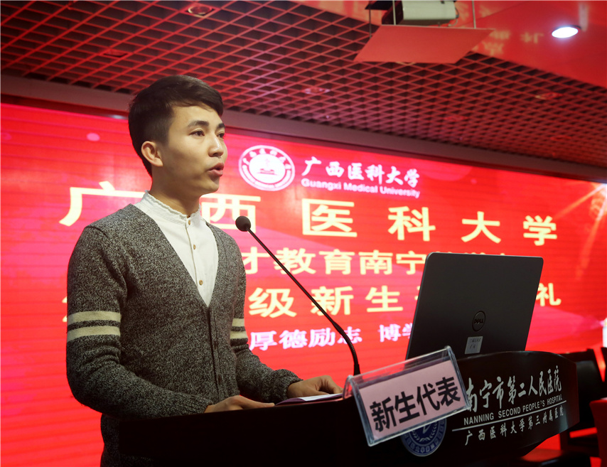 趙邦院長(zhǎng)代表廣西醫(yī)科大學(xué)繼續(xù)教育學(xué)院,向2019級(jí)新生表示熱烈的歡迎和衷心的祝賀!向辛勤耕耘、艱辛付出的廣西育才教育教學(xué)點(diǎn)的各位領(lǐng)導(dǎo)和教職工致以誠(chéng)摯的感謝!趙院長(zhǎng)向新同學(xué)介紹了我校辦學(xué)歷史基本情況,并提出了三點(diǎn)殷切期望:一要厚德勵(lì)志,博學(xué)弘醫(yī)。要牢記校訓(xùn),踐行校訓(xùn),嚴(yán)格要求自己,掌握精湛醫(yī)術(shù),“修德修身,醫(yī)國(guó)醫(yī)人”,不斷升華精神境界,發(fā)揚(yáng)白求恩救死扶傷的精神,立志做新時(shí)代的南丁格爾,成為一名醫(yī)術(shù)精湛、醫(yī)德高尚的醫(yī)務(wù)工作者。二要不忘初心,行穩(wěn)致遠(yuǎn)。要不忘初心,主動(dòng)適應(yīng),轉(zhuǎn)變意識(shí),轉(zhuǎn)換角色,遵守教學(xué)點(diǎn)的紀(jì)律和規(guī)定,做到工作、學(xué)習(xí)“兩不誤,雙促進(jìn)”,實(shí)現(xiàn)人生規(guī)劃“彎道超越”。三要追夢(mèng)前行,壯美人生。要腳踏實(shí)地,用心治學(xué),為天天學(xué)習(xí)“打卡”,揮灑汗水奮力拼,共圓人生夢(mèng)想。