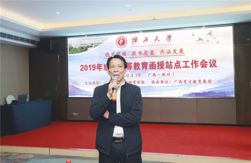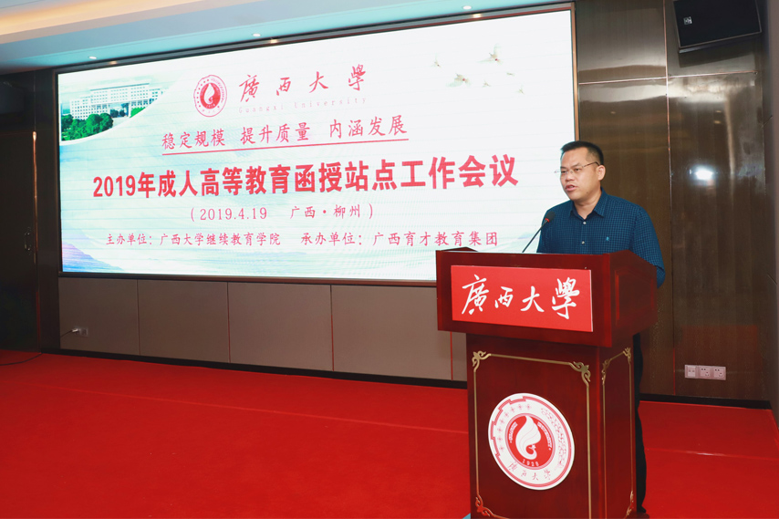 4月19日,廣西大學(xué)2019年成人高等教育函授站點(diǎn)工作會(huì)議在柳州順利召開(kāi),本次會(huì)議由廣西大學(xué)繼續(xù)教育學(xué)院主辦,廣西育才教育集團(tuán)承辦,廣西大學(xué)繼續(xù)教育學(xué)院院長(zhǎng)蘇兆成、副院長(zhǎng)陳海、各科室科長(zhǎng)老師、各函授站(教學(xué)點(diǎn))負(fù)責(zé)人以及教務(wù)管理人員40余人參加了會(huì)議。我函授站站長(zhǎng)蔣華、副站長(zhǎng)王志男參加了會(huì)議,會(huì)議由副站長(zhǎng)王志男主持。