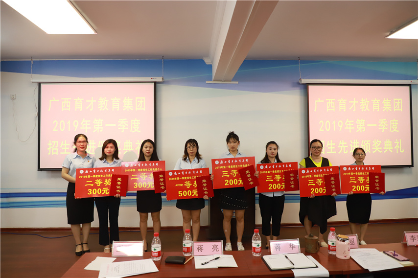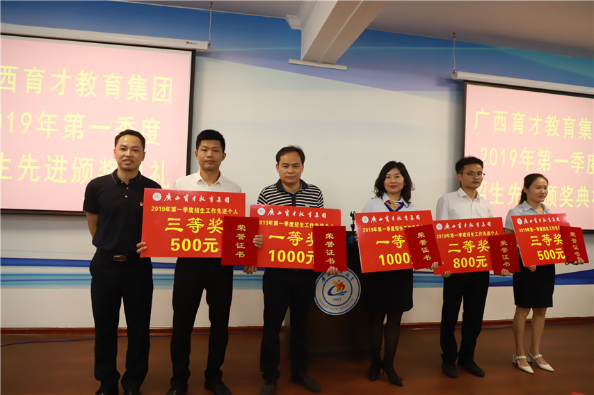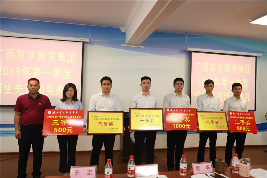 會議對2019年一季度招生先進集體及招生先進個人進行了表彰,副總經理王志男宣讀了《廣西育才教育集團2019年季度招生先進集體及招生先進個人獎勵辦法(試行)》和《廣西育才教育集團關于表彰2019年季度招生先進集體及招生先進個人的表彰決定》,集團領導分別為獲獎的先進集體和個人頒發(fā)了獎金和證書。