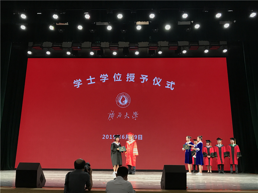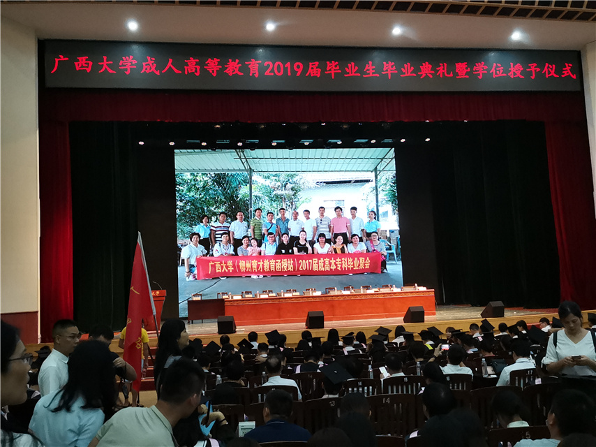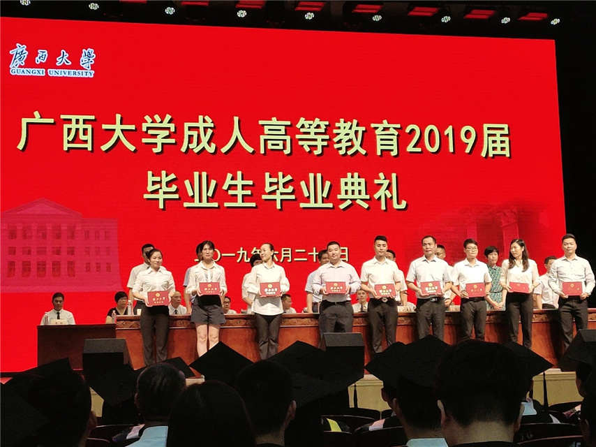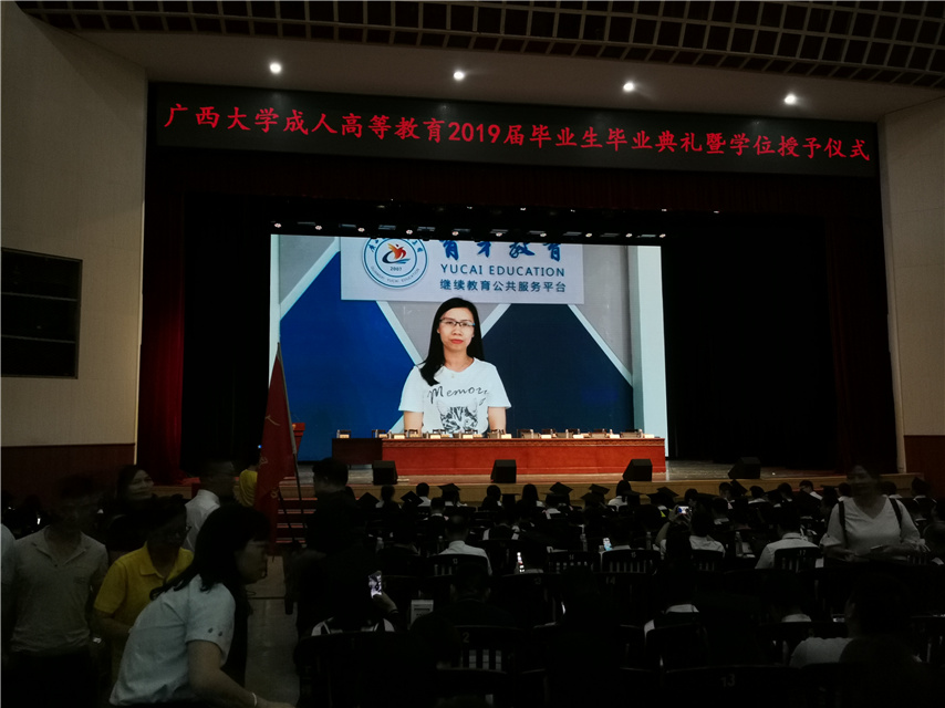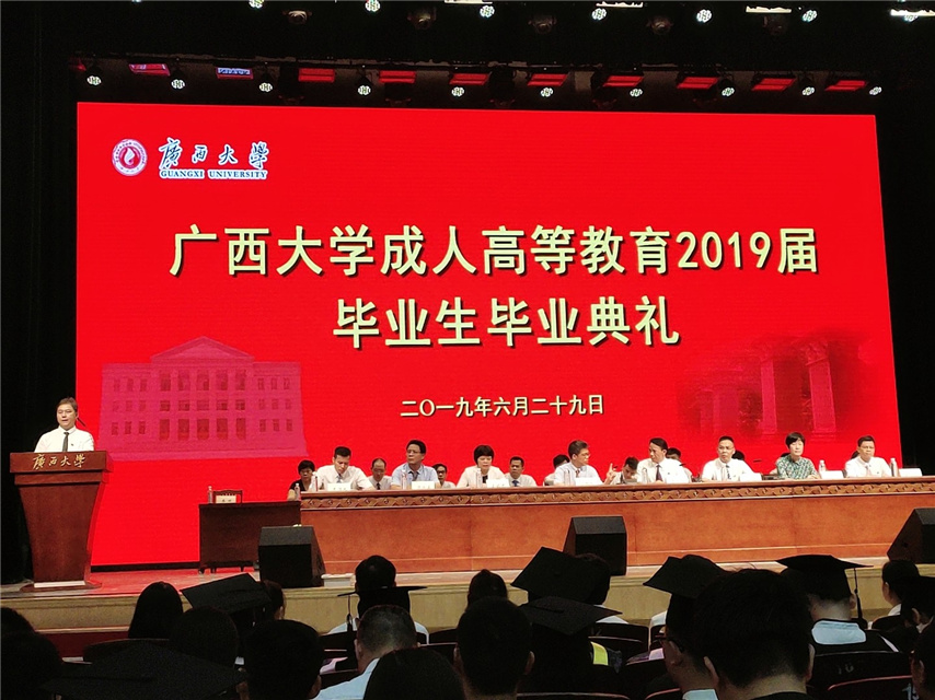 6月29日,廣西大學成人高等教育2019屆畢業(yè)生畢業(yè)典禮暨學位授予儀式在廣西大學校本部大禮堂隆重舉行。校黨委常委、總會計師寧旭初、繼續(xù)教育學院院長蘇兆成、副院長王曉花、陳海、譚鴻禹、各科室科長老師、校友代表、各函授點(教學點)負責人及2019屆成人高等教育畢業(yè)生代表1400余人參加了典禮。我函授站站長蔣華參加了典禮,典禮由繼續(xù)教育學院院長蘇兆成主持。