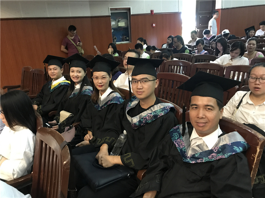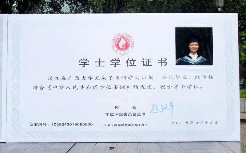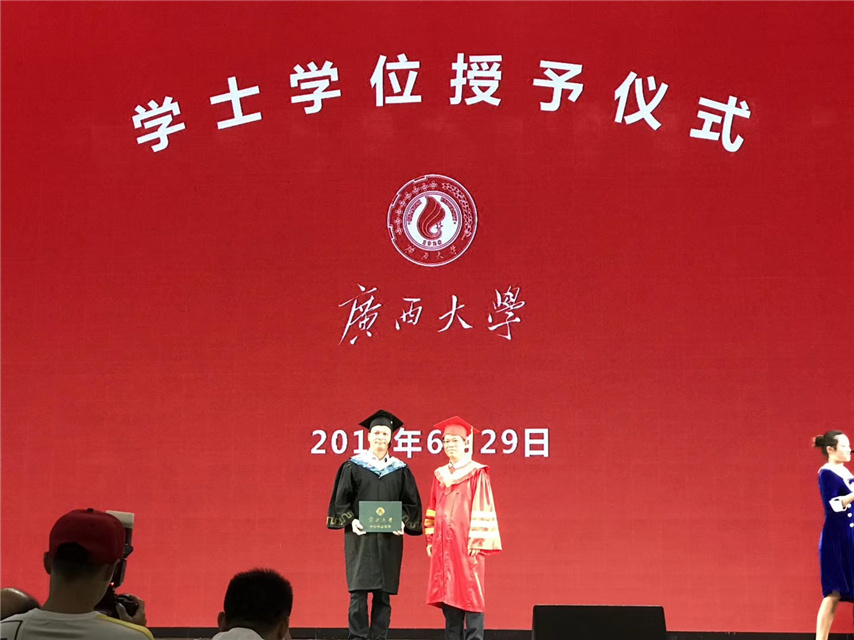 在隨后進行的學位授予儀式上,繼續(xù)教育學院院長蘇兆成宣讀了關于授予廣西大學成人高等教育本科畢業(yè)生成人高等教育學士學位的決定,寧旭初總會計師逐一為畢業(yè)生代表撥穗正冠執(zhí)“撥穗禮”,頒發(fā)學位證書并與同學合影。