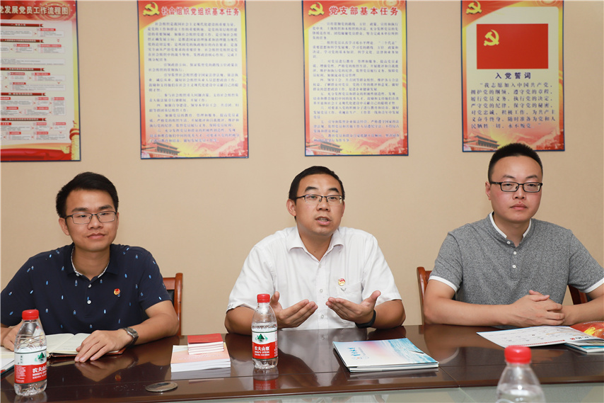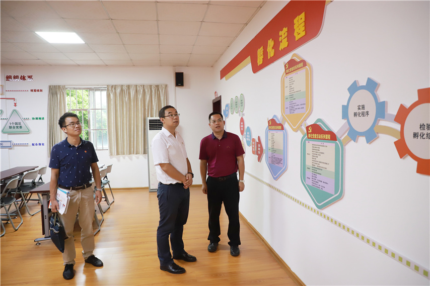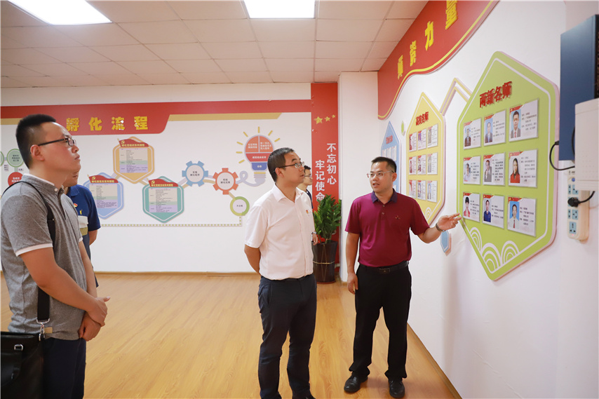 ▲團(tuán)市委副書(shū)記張揚(yáng)(中)、團(tuán)市委組織部副部長(zhǎng)華海濤(左一)參觀黨建孵化站建設(shè)