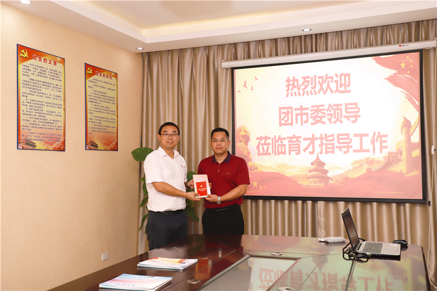 ▲團(tuán)市委副書(shū)記張揚(yáng)(左)向集團(tuán)聯(lián)合黨委蔣華書(shū)記贈(zèng)送《中國(guó)共產(chǎn)主義青年團(tuán)章程》及《柳州共青團(tuán)基層組織建設(shè)制度年編》