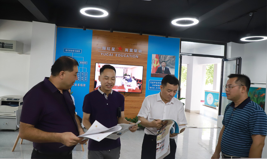 ▲廣西理工職業(yè)技術學院副院長黃日木(右二)、繼續(xù)教育學院院長盛丹(左一)翻閱育才報刊
