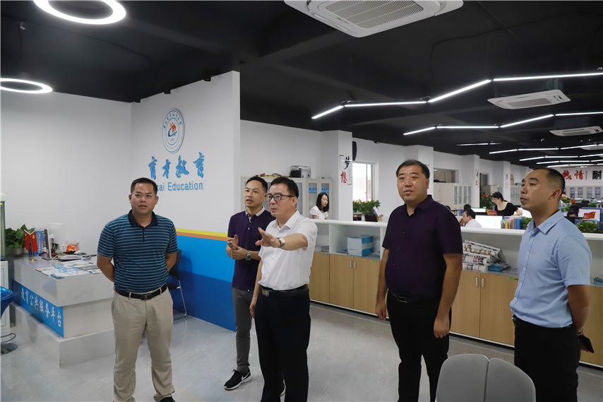 ▲廣西理工職業(yè)技術學院副院長黃日木(中)、繼續(xù)教育學院院長盛丹(右二)參觀育才辦學環(huán)境