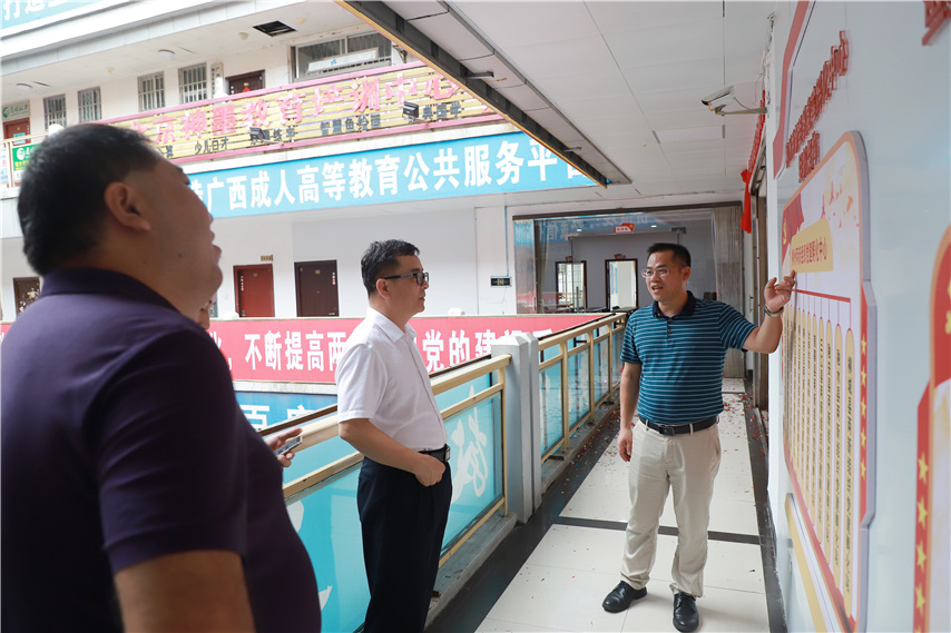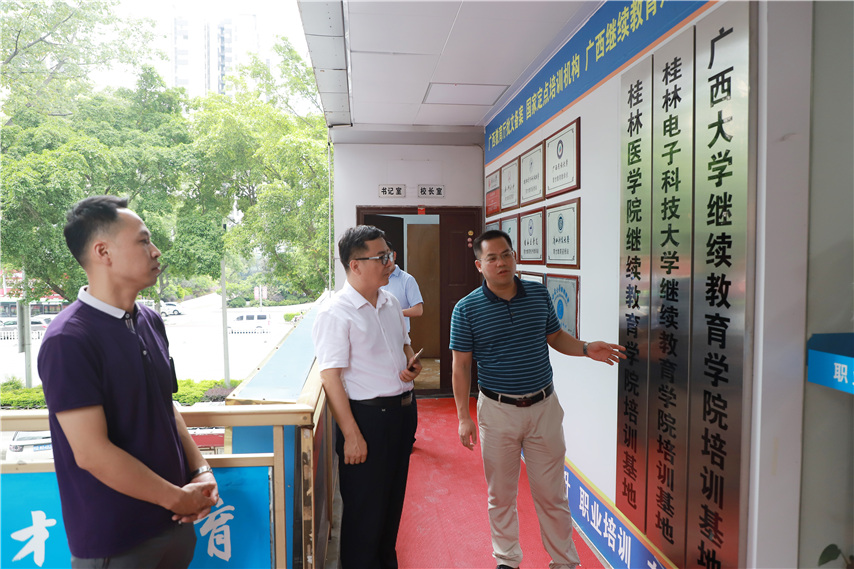 ▲廣西理工職業(yè)技術學院副院長黃日木(右二)、繼續(xù)教育學院院長盛丹(左一)參觀育才辦學環(huán)境