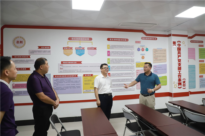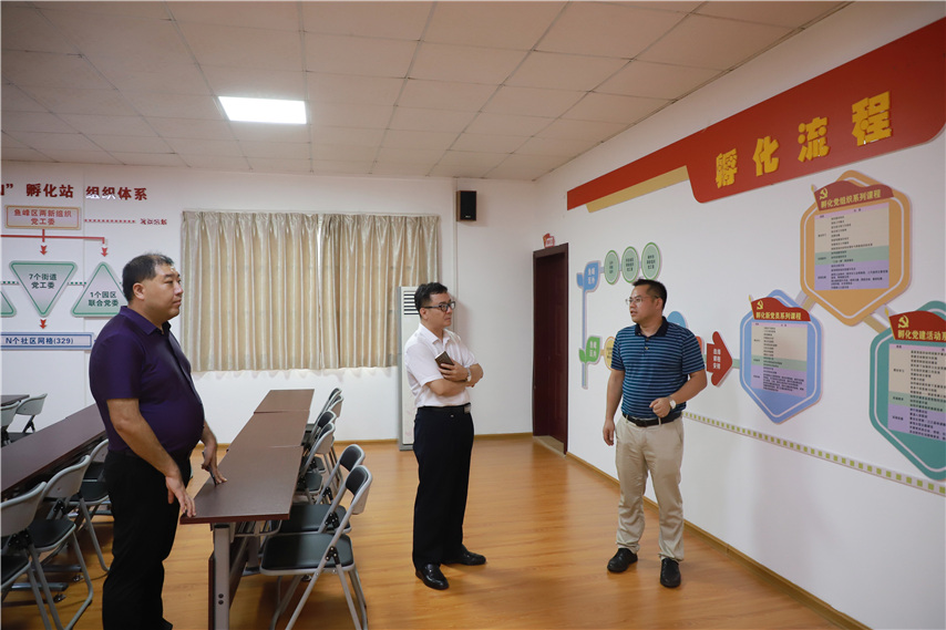▲廣西理工職業(yè)技術學院副院長黃日木(中)、繼續(xù)教育學院院長盛丹(左一)參觀孵化站建設