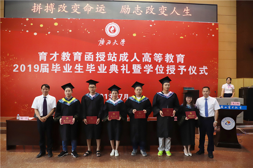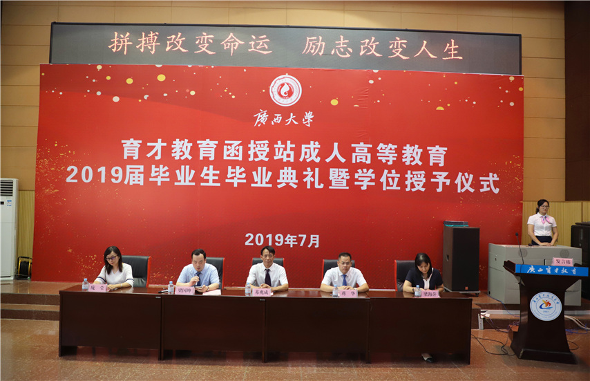 7月21日上午,廣西大學(xué)育才教育函授站成人高等教育2019屆畢業(yè)生畢業(yè)典禮暨學(xué)位授予儀式在柳州本部隆重舉行。廣西大學(xué)繼續(xù)教育學(xué)院院長(zhǎng)蘇兆成、招生與學(xué)生管理科科長(zhǎng)梁海萍、辦公室副主任龐瑩、集團(tuán)聯(lián)合黨委書(shū)記、董事長(zhǎng)、函授站站長(zhǎng)蔣華以及100余名畢業(yè)生代表參加了畢業(yè)典禮,典禮由集團(tuán)總校校長(zhǎng)梁國(guó)坤主持。