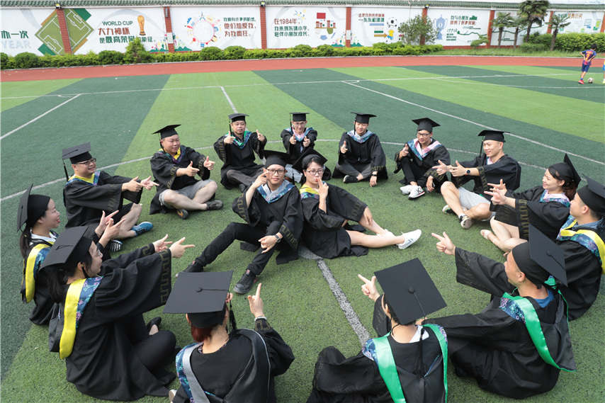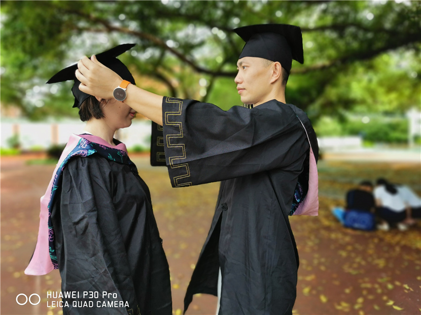 典禮上,繼續(xù)教育學(xué)院院長(zhǎng)蘇兆成逐一為畢業(yè)生代表?yè)芩胝趫?zhí)“撥穗禮”,頒發(fā)學(xué)位證書(shū)并與同學(xué)合影。