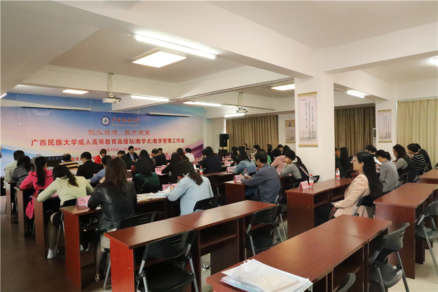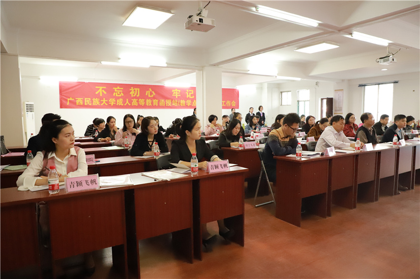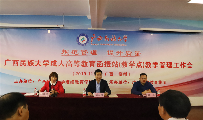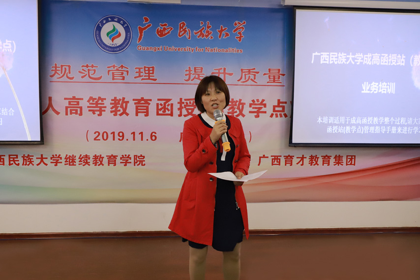 11月6日,廣西民族大學(xué)2019年成人高等教育函授站(教學(xué)點(diǎn))教學(xué)管理工作會(huì)在柳州順利召開,本次會(huì)議由廣西民族大學(xué)繼續(xù)教育學(xué)院主辦,廣西育才教育集團(tuán)承辦,廣西民族大學(xué)繼續(xù)教育學(xué)院黨總支書記、院長(zhǎng)覃志和,副院長(zhǎng)唐曉華,辦公室主任黃招揚(yáng),學(xué)歷教育科科長(zhǎng)陳家寧,科室老師,各函授站(教學(xué)點(diǎn))負(fù)責(zé)人以及教務(wù)管理人員50余人參加了會(huì)議。我函授站站長(zhǎng)蔣華參加了會(huì)議,會(huì)議由唐曉華副院長(zhǎng)主持。