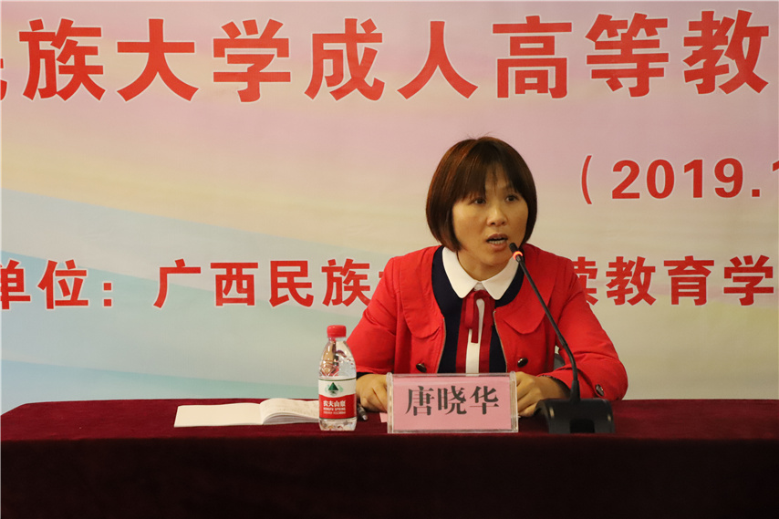 ▲廣西民族大學(xué)繼續(xù)教育學(xué)院副院長(zhǎng)唐曉華主持會(huì)議