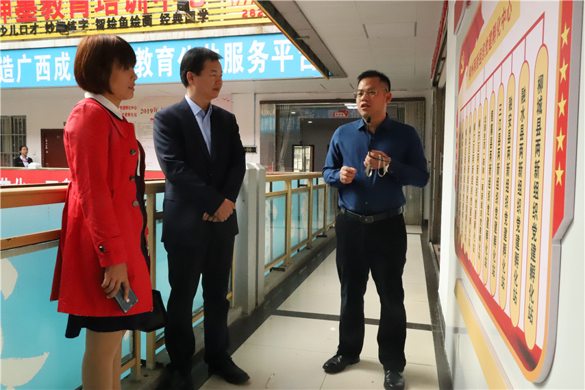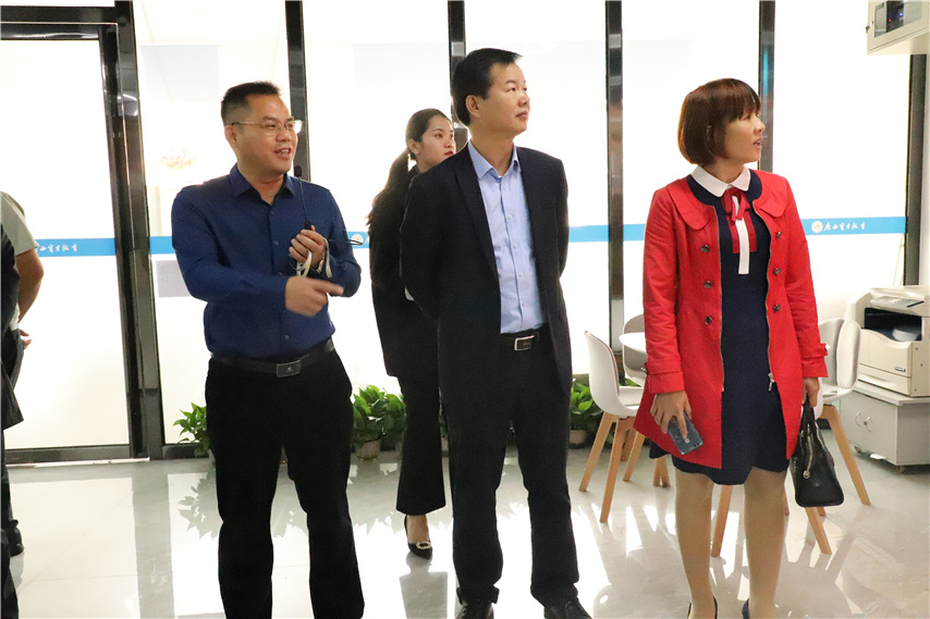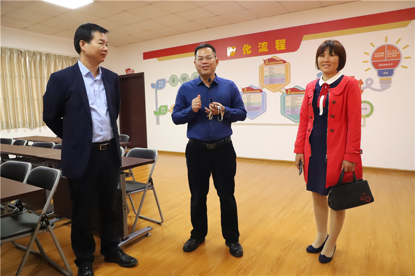 ▲覃志和院長(zhǎng)(中)和唐曉華副院長(zhǎng)(左一)了解黨建孵化中心架構(gòu)