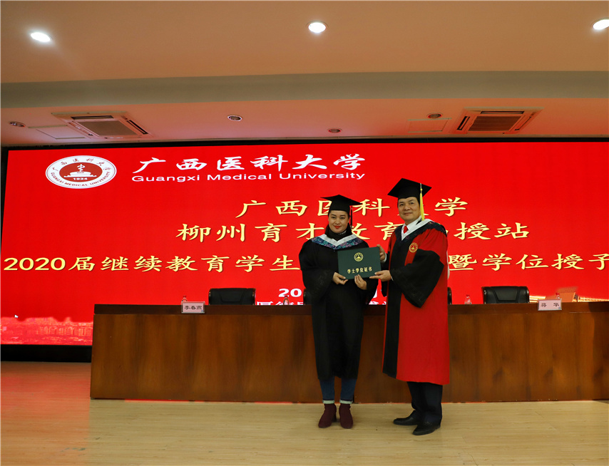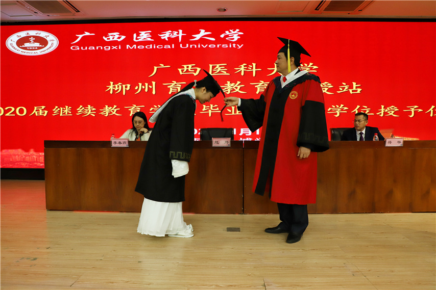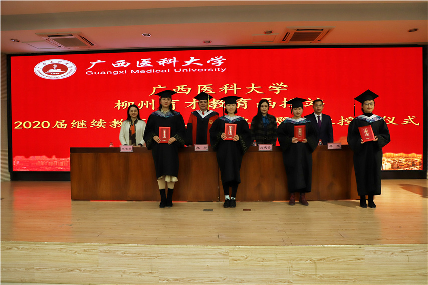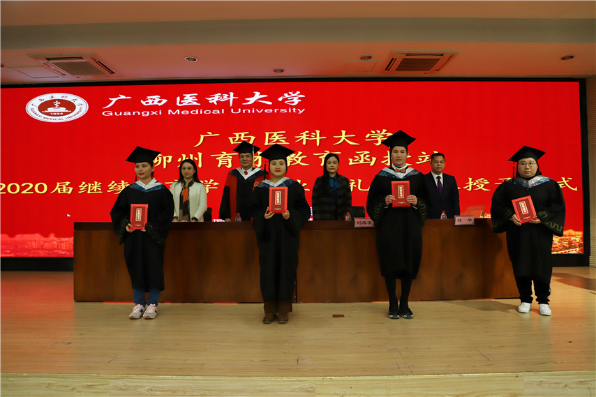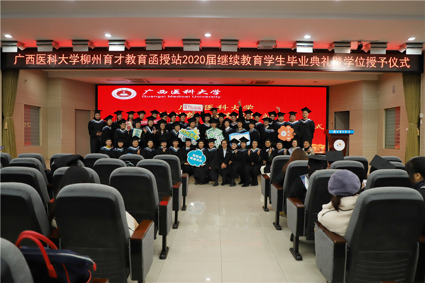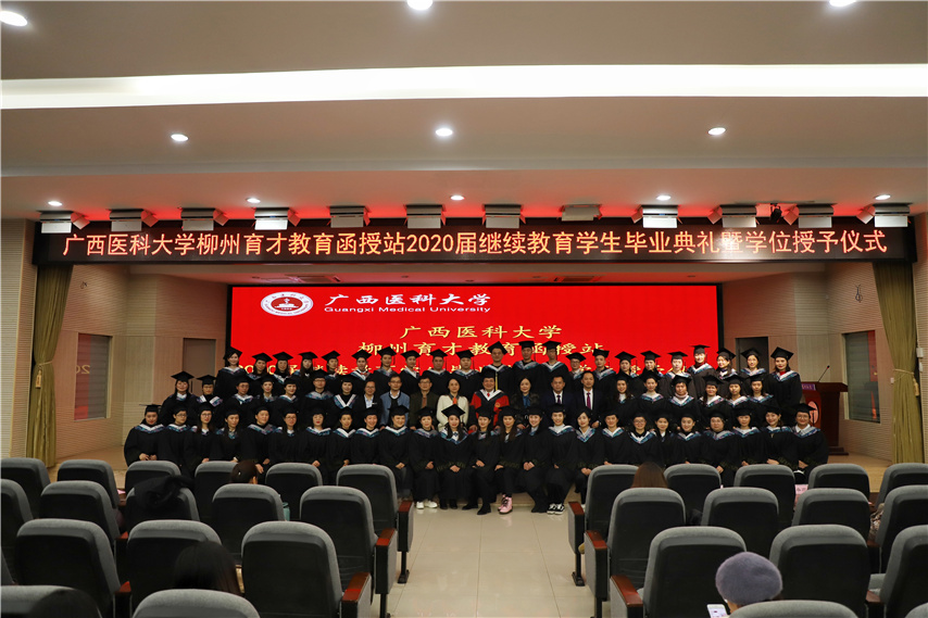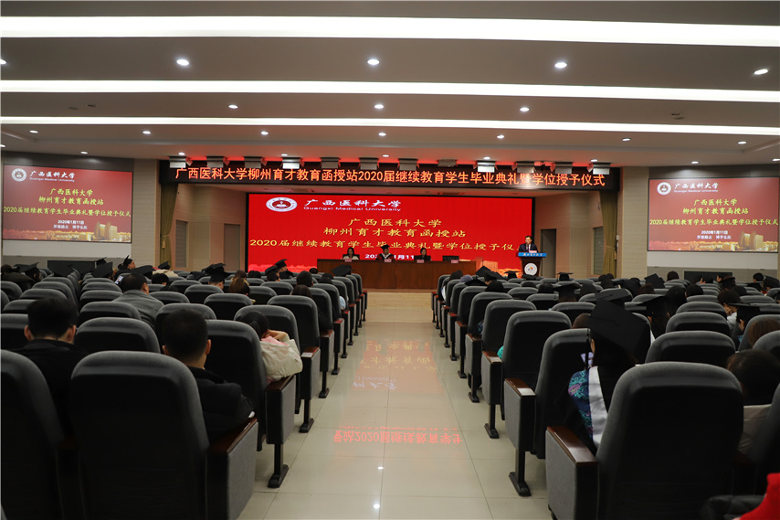 1月11日下午,廣西醫(yī)科大學(xué)柳州育才教育函授站2020屆成高畢業(yè)典禮暨學(xué)位授予儀式在柳州市人民醫(yī)院第一學(xué)術(shù)報告廳隆重舉行。廣西醫(yī)科大學(xué)繼續(xù)教育學(xué)院院長、廣西醫(yī)科大學(xué)學(xué)位評定委員會委員、主任醫(yī)師趙邦教授、副院長劉慶委、李春燕,院辦主任黃明、教務(wù)科科長馮政毅、招生工作與學(xué)生管理科科長韋先良,集團聯(lián)合黨委書記、董事長、函授站站長蔣華以及來自柳州醫(yī)藥系統(tǒng)畢業(yè)生代表參加了畢業(yè)典禮,典禮由集團聯(lián)合黨委副書記、副站長王志主持。