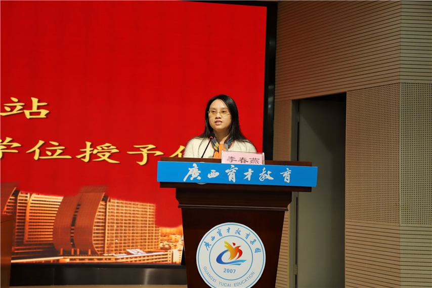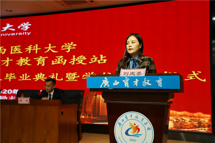 繼續(xù)教育學(xué)院副院長李春燕向圓滿完成學(xué)業(yè)的畢業(yè)生們表示誠摯的祝賀并對大力支持學(xué)校成教工作的育才函授站表示衷心的感謝。她說,同學(xué)們克服工作和家庭的壓力,披星戴月,艱苦奮斗,終于實現(xiàn)了夢想,嘗到了收獲的喜悅,這是一筆寶貴的財富,同時也完成了一個重要提升,幸福是奮斗出來的,同學(xué)們已經(jīng)用事實證明了自己的優(yōu)秀。提出三點希望:一、要繼續(xù)牢記和踐行“厚德勵志,博學(xué)弘醫(yī)”的校訓(xùn),弘揚醫(yī)大精神,掌握精湛的醫(yī)術(shù),修德修身,醫(yī)國醫(yī)人,不斷升華自己的精神境界;二、希望同學(xué)們不忘學(xué)醫(yī)的初心,牢記使命,為自己的夢想繼續(xù)奮斗,在各自平凡的工作崗位上取得新的突破、創(chuàng)造新的輝煌,要以醫(yī)為豪,委以重任,醫(yī)學(xué)是造福人類、造福社會的學(xué)科,要牢記醫(yī)者之使命,恪守行醫(yī)的職責(zé),懷著一顆仁愛之心,履行懸壺濟世、救死扶傷的道義;三、要不忘初心,共創(chuàng)輝煌,提高本領(lǐng),擁抱生活,繼續(xù)學(xué)習(xí),畢業(yè)不是學(xué)習(xí)的終止,要樹立終身學(xué)習(xí)的理念。不管走得多遠(yuǎn),飛得多高,希望同學(xué)們常回家看看,未來我們相約八桂大地,建設(shè)壯美廣西,共圓復(fù)興夢想。