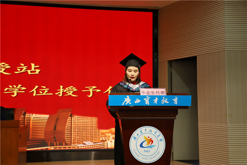 2017級護理學(xué)本科專業(yè)、來自柳州市人民醫(yī)院的王燕作為畢業(yè)生代表發(fā)言,她說,經(jīng)過三年的不懈努力,終于完成學(xué)業(yè)獲得畢業(yè)證書。但畢業(yè)并不代表結(jié)束,而是歡呼的開始,不是已經(jīng)完成,而是宣布進步,今后要不斷學(xué)習(xí),填好人生的履歷表,為母校增輝添彩。