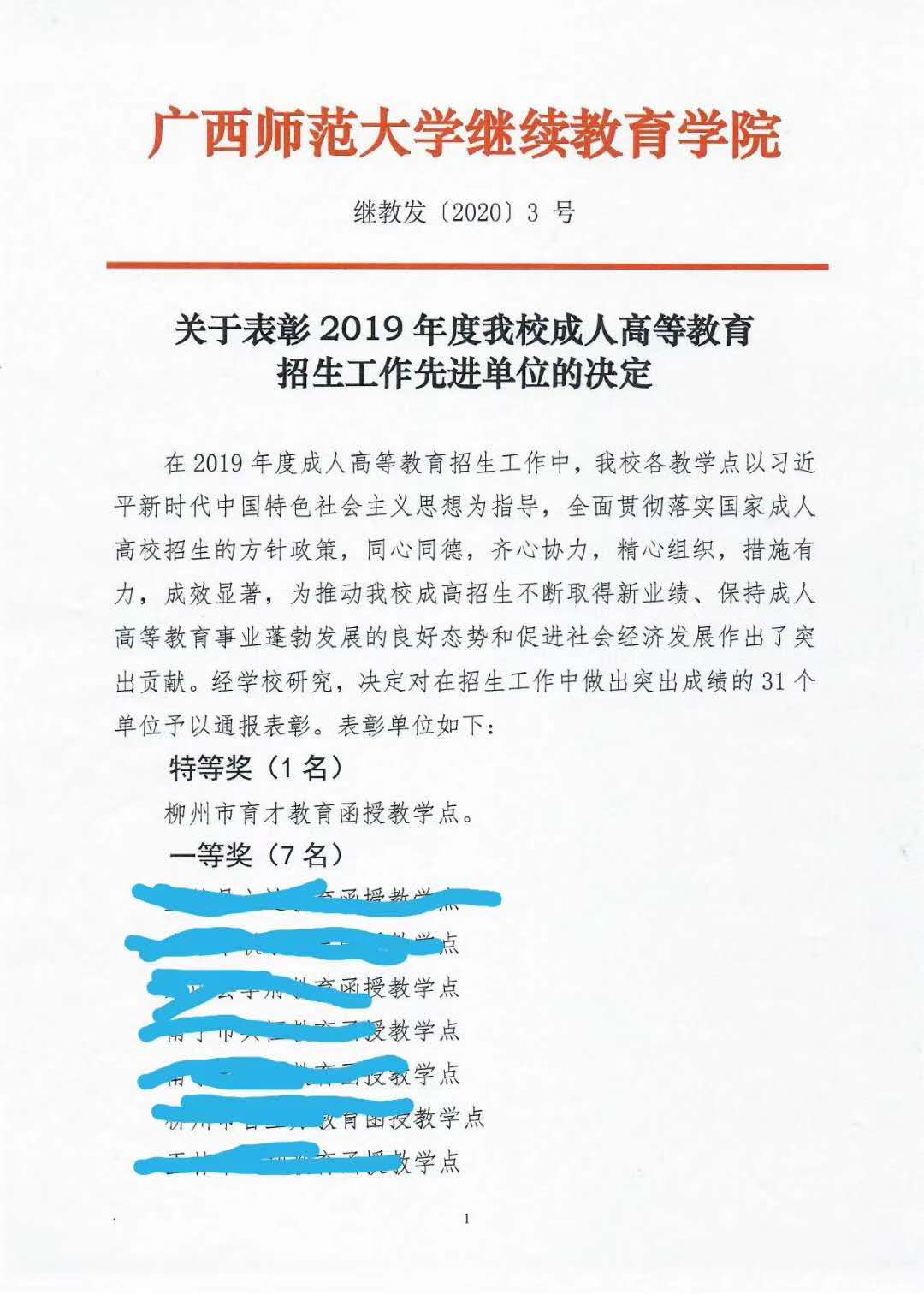 會(huì)議總結(jié)了2019年的成高招生工作,對(duì)2020年度成高工作進(jìn)行了布置,表彰了在2019年度成人高等教育招生工作先進(jìn)單位,因工作出色,育才函授站榮獲廣西師范大學(xué)2019年度成人高等教育招生工作“特等獎(jiǎng)”。