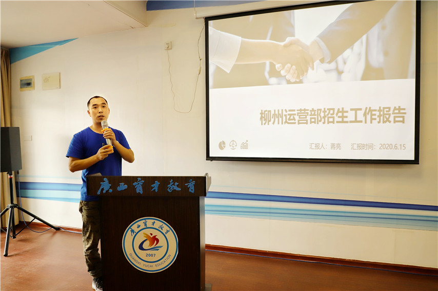 ▲黨委委員、副總經(jīng)理、副校長蔣亮作柳州運(yùn)營部上半年招生工作總結(jié)