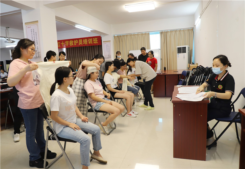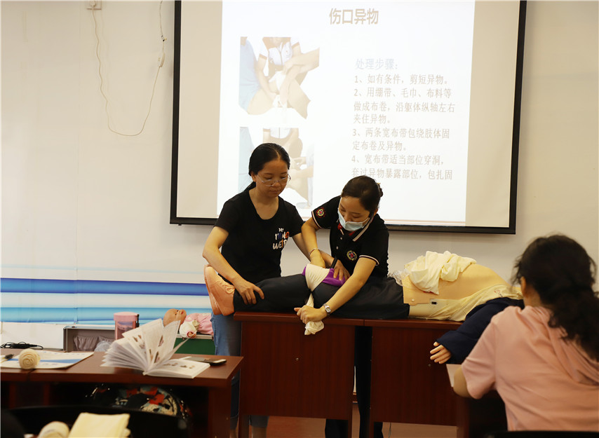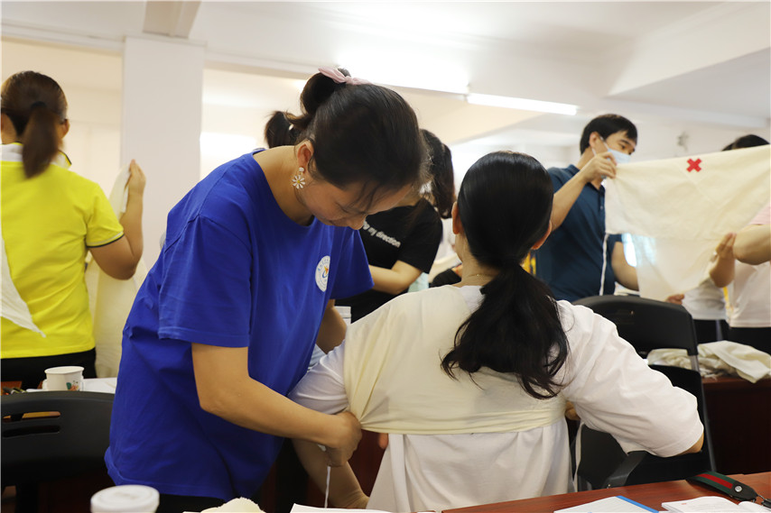 ▲紅十字會培訓(xùn)講師作傷口異物包扎的示范