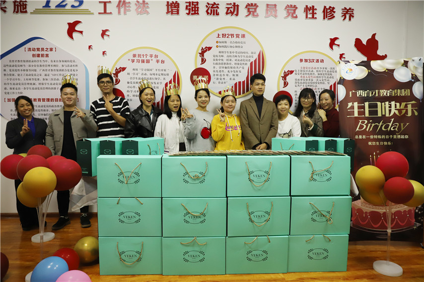 集團(tuán)工會(huì)為壽星們精心準(zhǔn)備了精美生日禮物,10月下旬,大家?guī)е鹈?,帶著微笑,帶著祝福,齊聚集團(tuán)本部柳州水晶印象206室共同慶生,集團(tuán)30余名教職工參加。