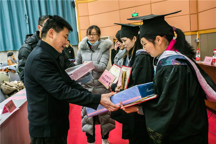 ▲領(lǐng)導(dǎo)為畢業(yè)生代表頒發(fā)畢業(yè)證書、學(xué)位證書,為在新冠肺炎疫情防控工作中表現(xiàn)突出的2021屆優(yōu)秀畢業(yè)生代表頒發(fā)榮譽證書和獎金、慰問品