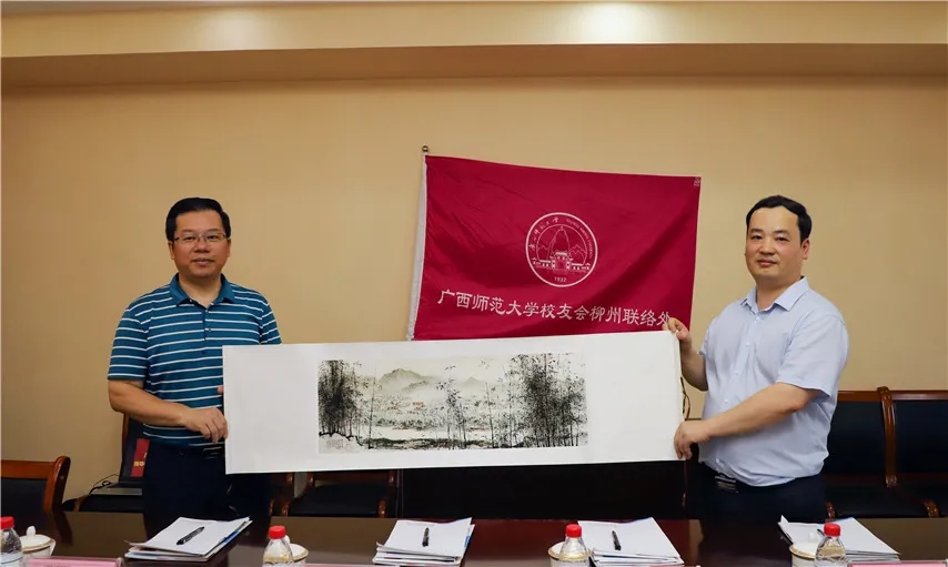 ▲廣西師范大學(xué)校友會(huì)柳州聯(lián)絡(luò)處設(shè)在廣西育才教育集團(tuán),廣西師范大學(xué)校長(zhǎng)、校友會(huì)會(huì)長(zhǎng)賀祖斌(左)向廣西師范大學(xué)柳州校友分會(huì)常務(wù)副會(huì)長(zhǎng)、柳州校友企業(yè)聯(lián)盟會(huì)長(zhǎng)梁國(guó)坤(右)贈(zèng)送書(shū)畫(huà)紀(jì)念品