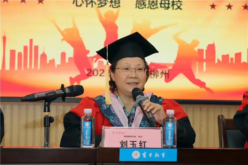 廣西師范大學(xué)繼續(xù)教育學(xué)院院長(zhǎng)、博士生導(dǎo)師劉玉紅教授講話,她說(shuō),在疫情防控常態(tài)化的新形勢(shì)下,祝賀同學(xué)們都順利完成了學(xué)業(yè)。成人高考所獲得的學(xué)歷是屬于國(guó)民教育行列的文憑,是被國(guó)家和社會(huì)所承認(rèn)的。成人高考的學(xué)歷是經(jīng)過(guò)電子注冊(cè)的,是可以在國(guó)家學(xué)信網(wǎng)上查到的學(xué)歷。無(wú)論走到哪里,希望各位校友常回母??纯?。