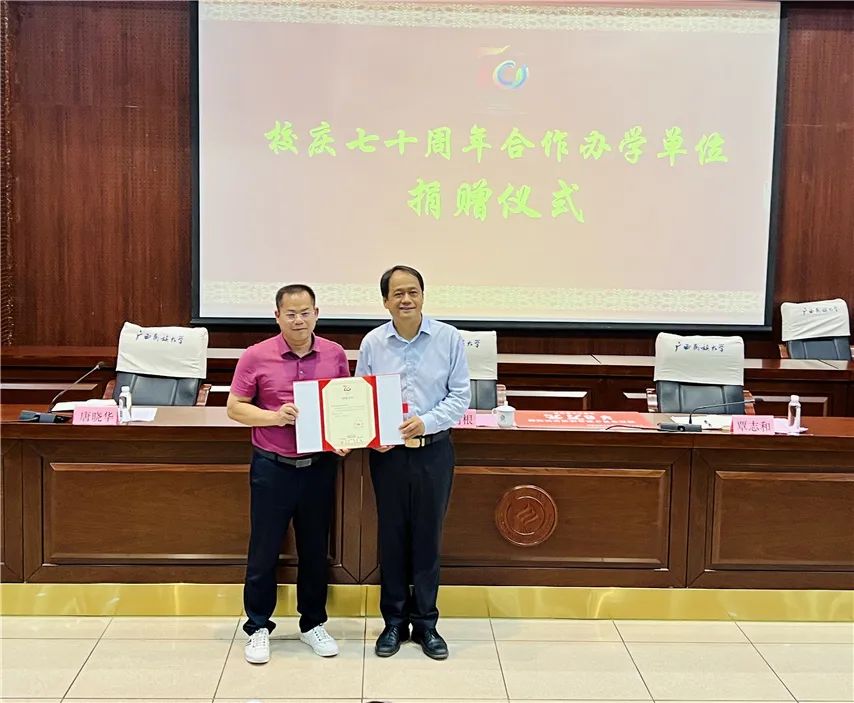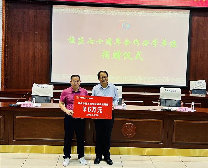 會上還舉行了廣西民族大學七十周年合作辦學單位捐贈儀式,我函授站負責人蔣華向廣西民族大學捐贈6萬元。校黨委常委、總會計師蔡高根代表學校接受捐贈,并向函授站頒發(fā)捐贈證書。