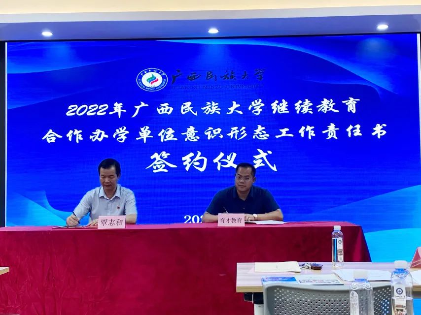 ▲繼續(xù)教育學院院長覃志和(左)與函授站負責人蔣華(右)簽訂合作辦學單位意識形態(tài)工作責任書