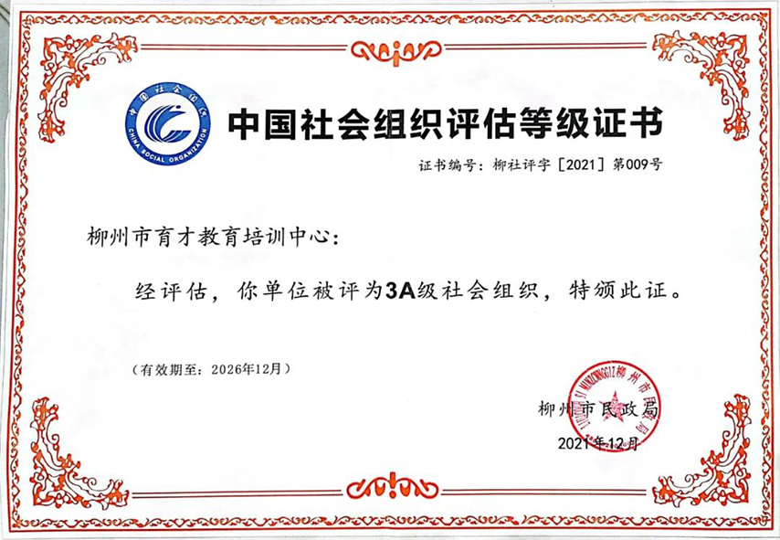柳州市民政局于2021年4月啟動(dòng)全市社會(huì)組織評(píng)估工作,按照“政府指導(dǎo)、社會(huì)參與、獨(dú)立運(yùn)作、分類評(píng)定”的原則,經(jīng)參評(píng)社會(huì)組織自評(píng)、聘請(qǐng)第三方評(píng)估機(jī)構(gòu)實(shí)地考察和初評(píng)、社會(huì)組織評(píng)估委員會(huì)終評(píng)和公示,近日,柳州市民政局對(duì)獲得3A等級(jí)以上的社會(huì)組織予以授牌,集團(tuán)旗下柳州市育才教育培訓(xùn)中心獲評(píng)柳州市3A社會(huì)組織。